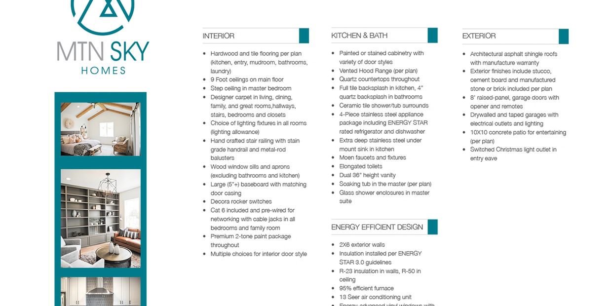 Home building with MTN SKY gives you total control from start to finish. Our flexibility allows us to offer a variety of price ranges and sizes for semi-custom homes. We have plans uniquely created by the Millhaven Design team to ensure your home has the highest level of quality. We also offer in-house interior design, or we would be more than happy to work with your own interior designer. If you don’t already have your financing lined up, check out our finance page that has all the info you need to know about our preferred lender. Here at MTN SKY, home building is exactly how you want it, at a price that makes sense.